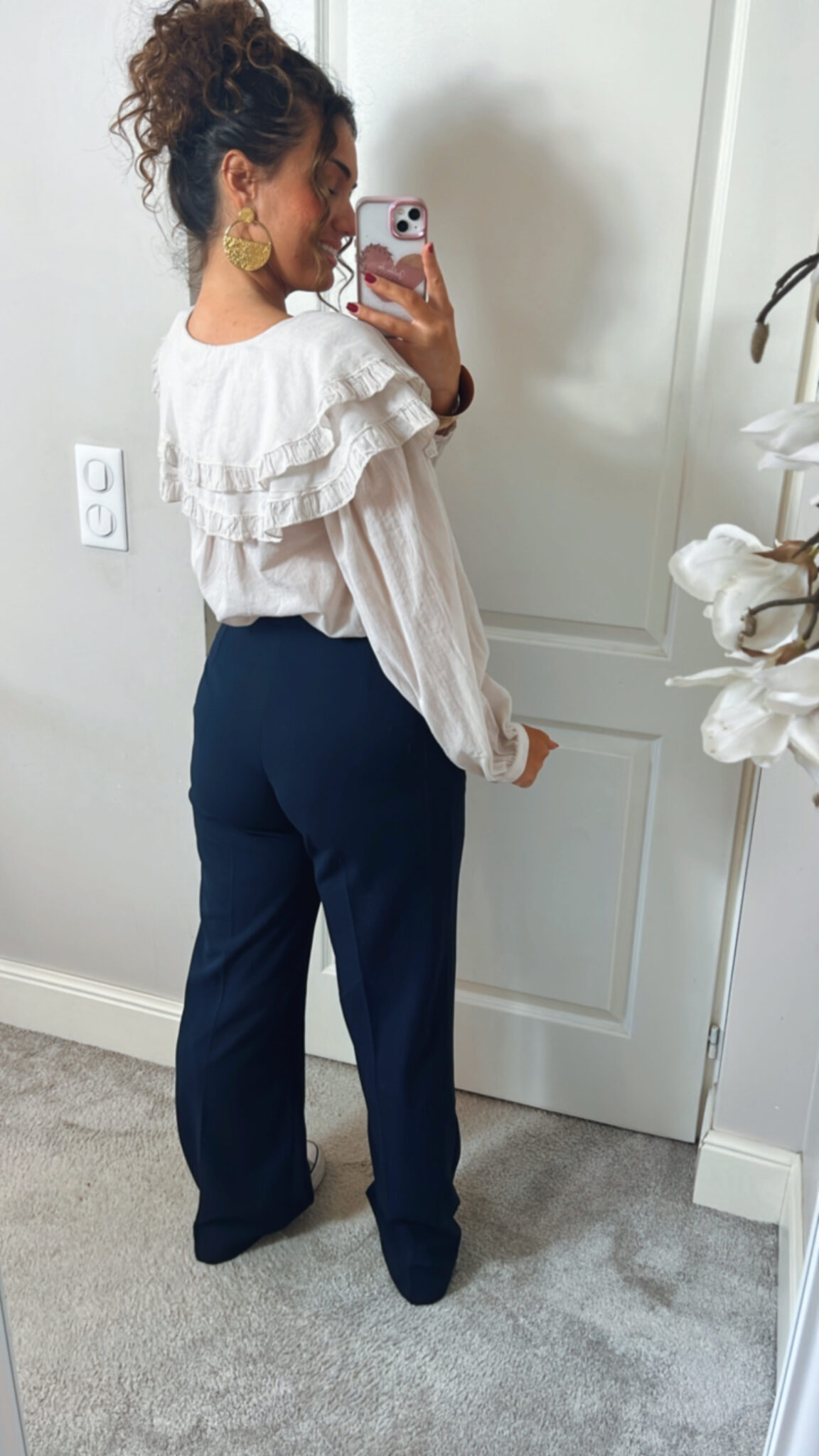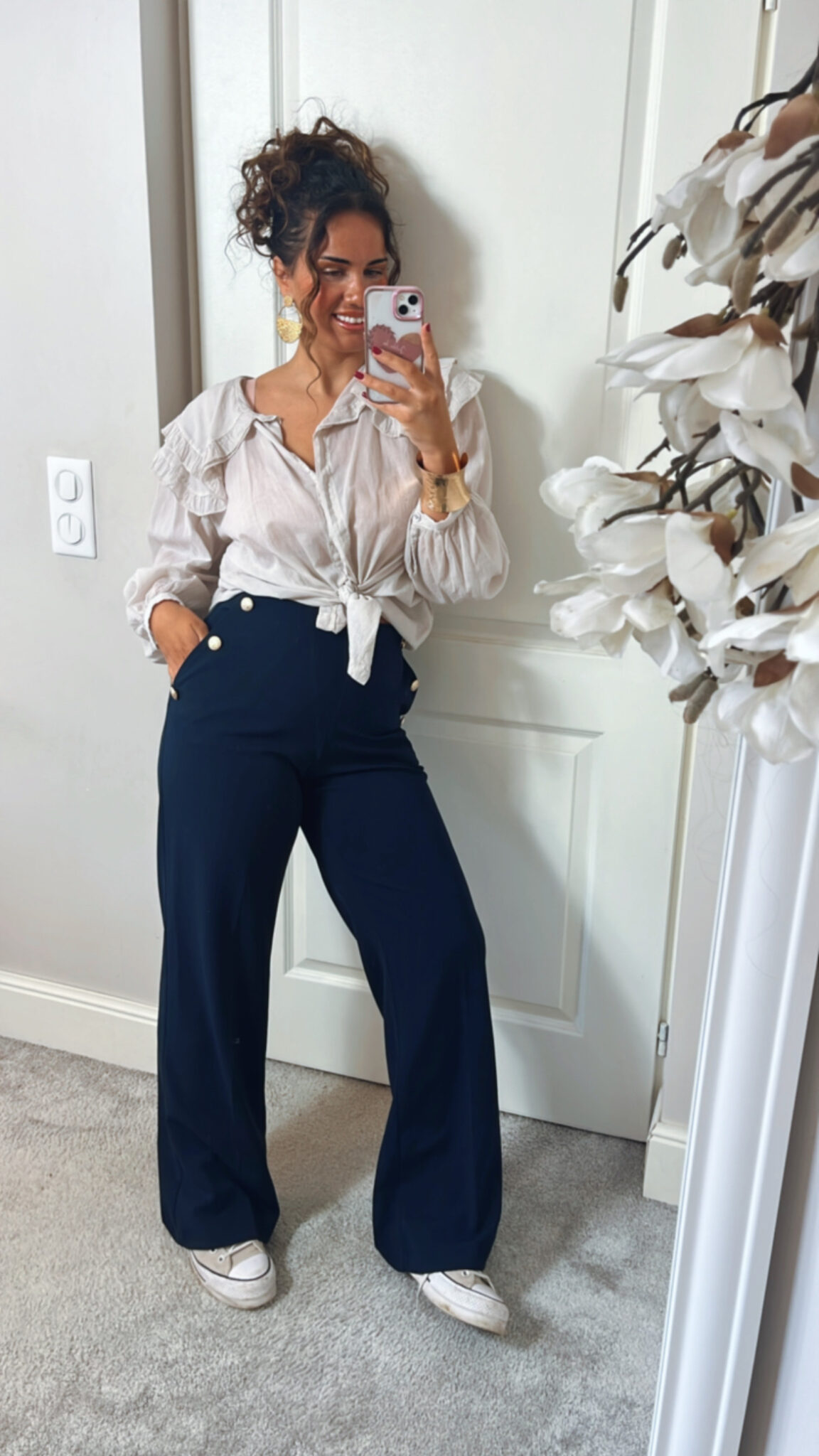 Si vous chercher le pantalon parfait pour une allure élégante et chic à porter en soirée mais à la fois que vous pourrez porter en journée avec vos baskets compensées vous êtes tombé sur le pantalon parfait.