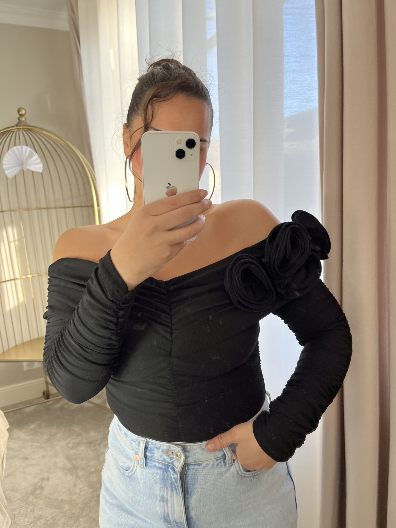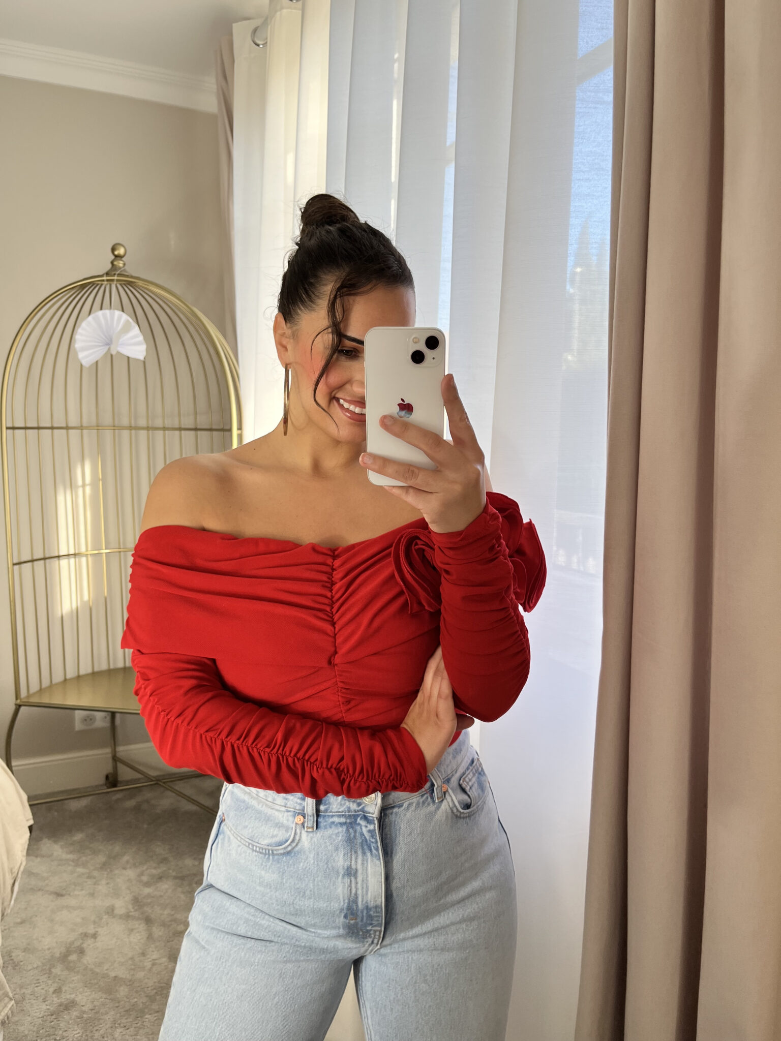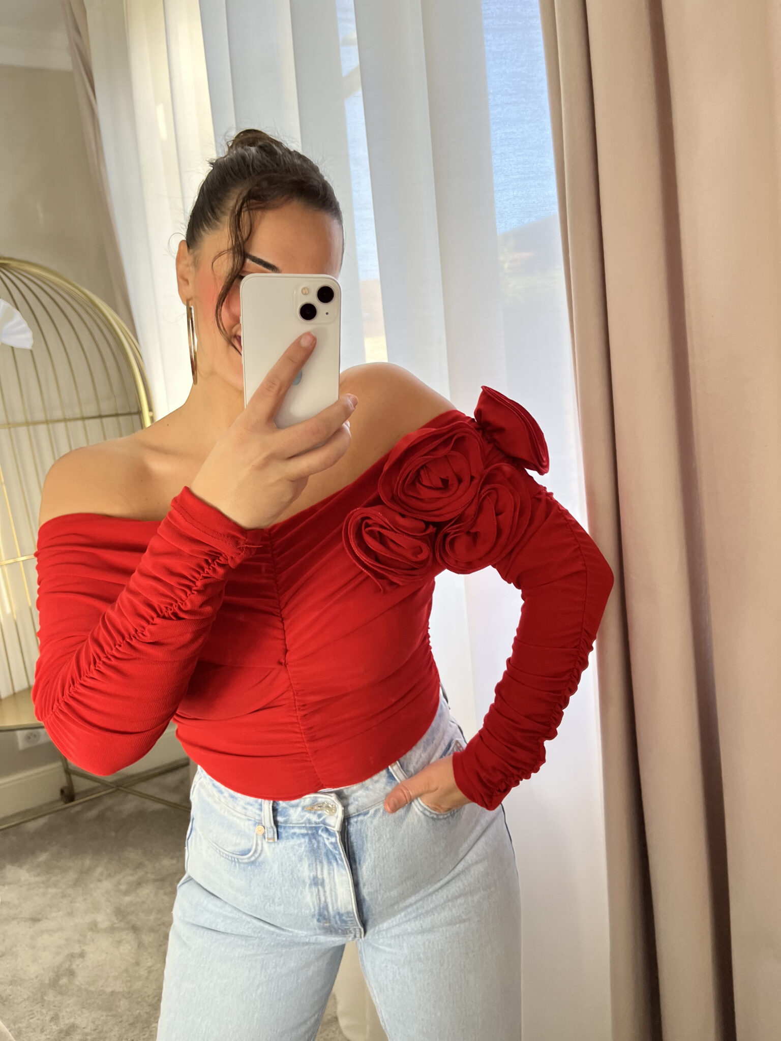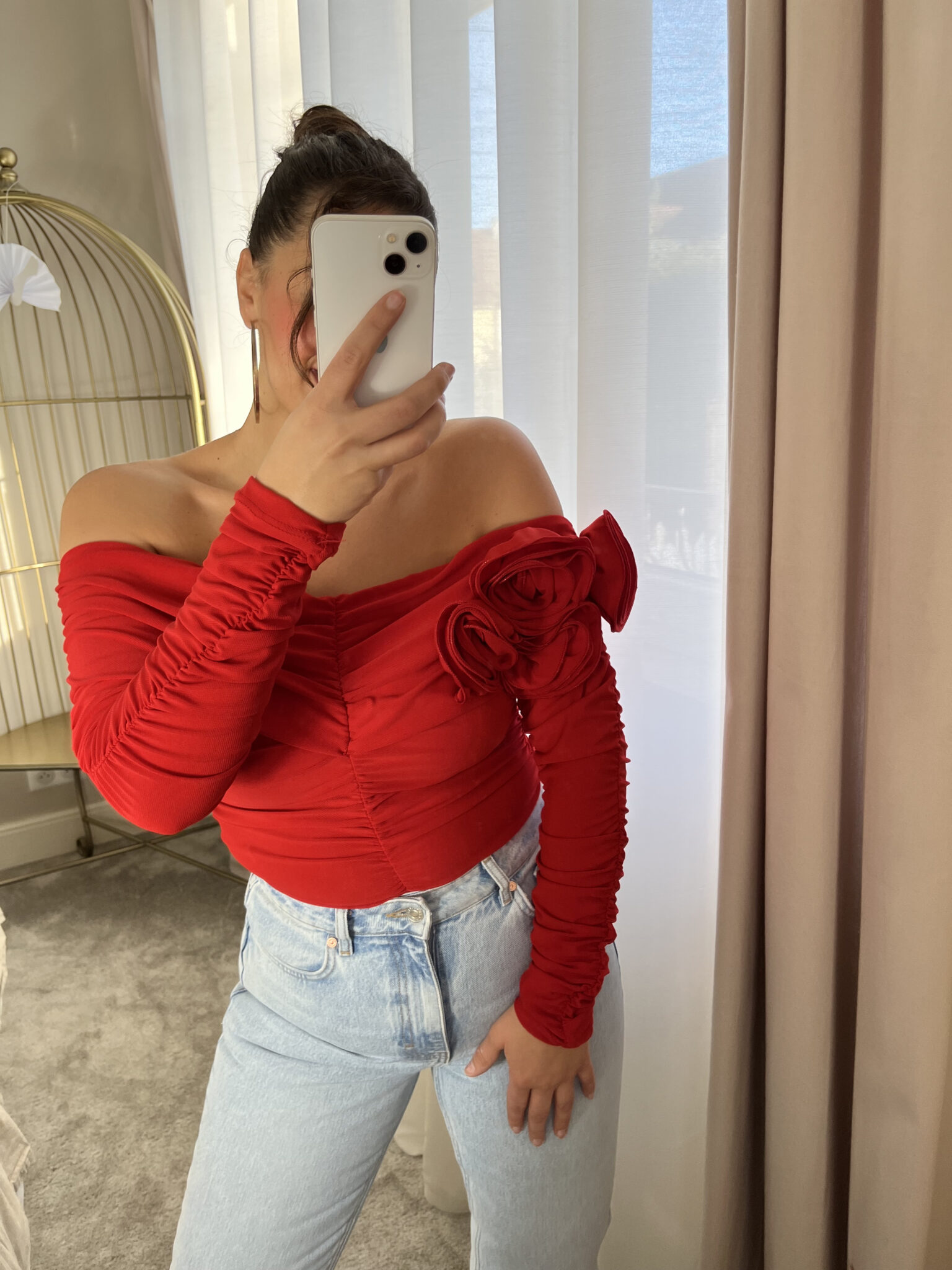 Le top Valentine à la douce couleur coquelicot avec ses fleurs en 3D sur l’épaule droite pour avoir une allure très féminine et romantique .